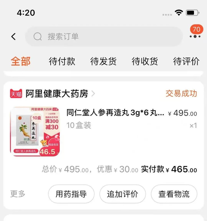 澎湃新闻根据阳先生提供的购物链接调查发现,购买“同仁堂人参再造丸”需先“提交预定”,并提示“处方药下单后需立即补充问诊信息”。阳先生介绍,他是在支付成功后,收到阿里健康的短信,“您购买处方药需要填写用药信息,否则订单将于24小时内自动关闭。”阳先生勾选了相关信息,次日再次收到阿里健康的信息,“医生已经根据您的病情描述开具了处方,处方会由专业药师审核,审核通过后将为您配药安排发货。”