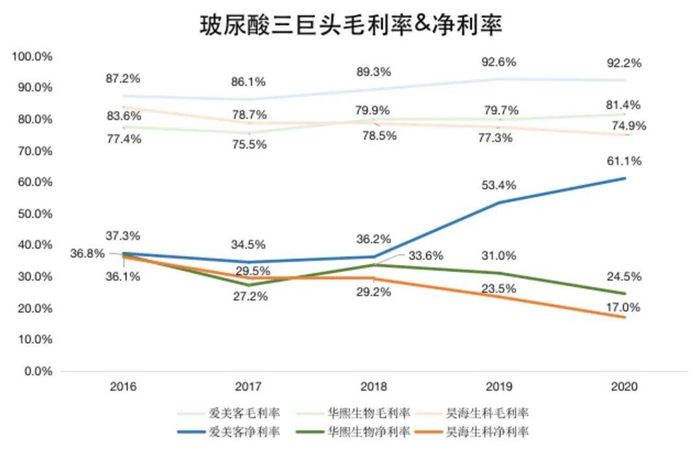 还有一点不可忽视,高毛利率的背后真正体现公司盈利能力的是净利润率数据。2020年,华熙生物、爱美客、昊海生科三大玻尿酸巨头的净利润率分别为24.5%、61.1%、17.0%。