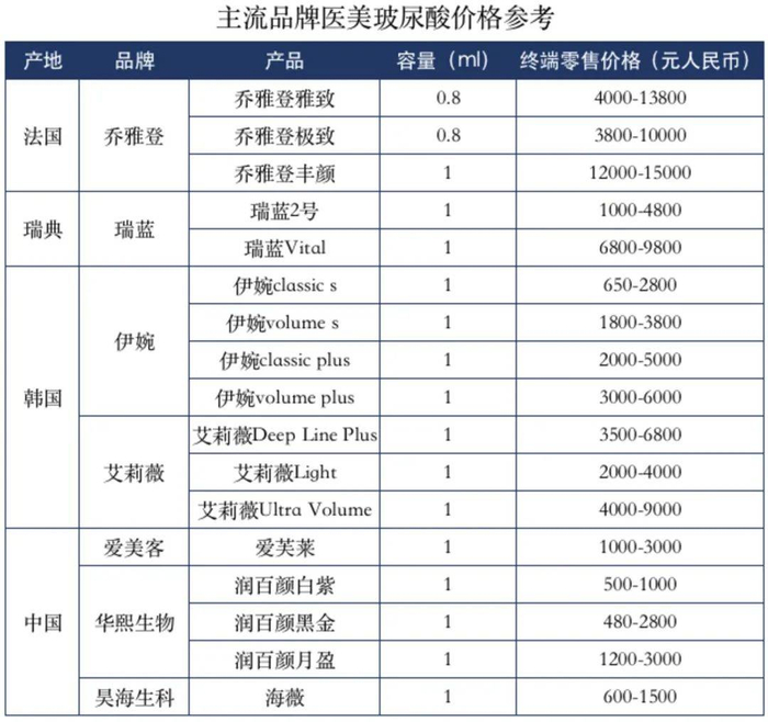 根据Frost&Sullivan数据,从销售金额占比来看,2019年国外企业占据前四,分别为韩国 LG(24.2%)、美国 Allergan(18.6%)、韩国 Humedix(14.3%)和瑞典 Q-Med(10.9%)。对比来看,进口的玻尿酸医美产品价格普遍高于本土产品。