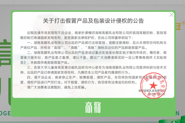 目前,消费者打开高骼乳业官网可以看到一则“关于打击假冒产品及包装设计侵权的公告”。该公告称,“近期流通市场发现有不法企业、商家抄袭模仿湖南高骼乳业有限公司的首冠高骼奶粉,首冠高骼奶粉已申请国家发明专利,是受国家法律保护的。”