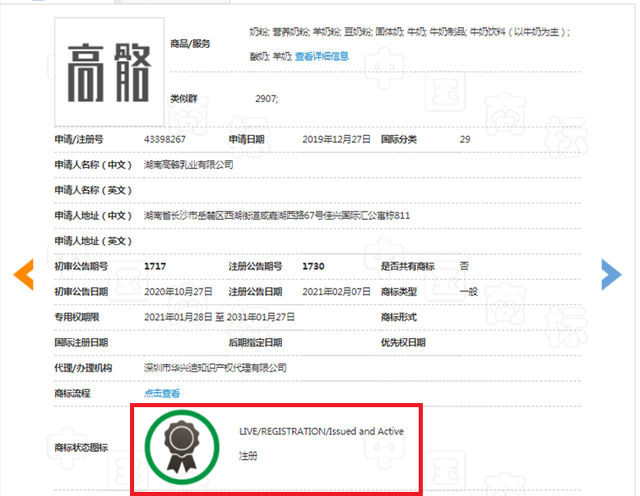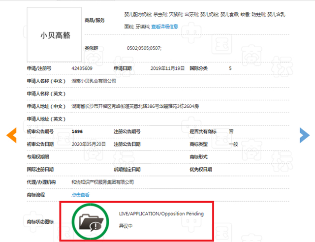 中国商标网查询结果显示,高骼乳业自2018年起共注册或申请注册了30多个“高骼”相关商标,2021年1月成功注册“高骼”第29类商标,应用范围为奶粉、牛奶等。小贝乳业曾于2019年11月申请注册第5类、第29类“小贝高骼”商标,目前状态均为“异议中”。
