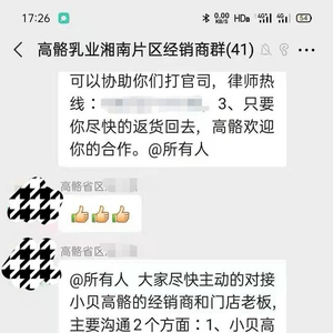 据知情人士向新京报记者提供的微信截图显示,近日在一个由41人组成的高骼乳业湘南片区经销商群中,有人号召群成员尽快与小贝高骼的经销商和门店老板沟通两方面内容:一是“小贝高骼确认山寨,建议停止销售,退货回厂家”,否则会被执行部门采取5-10倍的罚款;二是小贝高骼经销商可以拿起法律武器,只要能提供小贝高骼的打款凭证、合同、发货记录,可以协助打官司。“只要尽快把货返回去,高骼欢迎你的合作”。