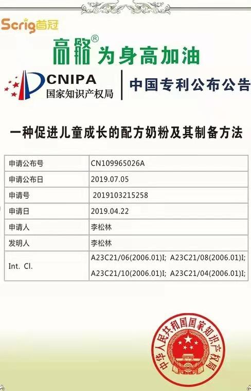 网传图片及首冠旗舰店客服展示的“专利证书”显示,其上部印有国家知识产权局名称、LOGO以及“中国专利公布公告”,中间为“一种促进儿童成长的配方奶粉及其制备方法”的专利申请公布号、申请公布日、申请号、申请日、申请人及发明人等,右下角则印有“中华人民共和国国家知识产权局”的印章。