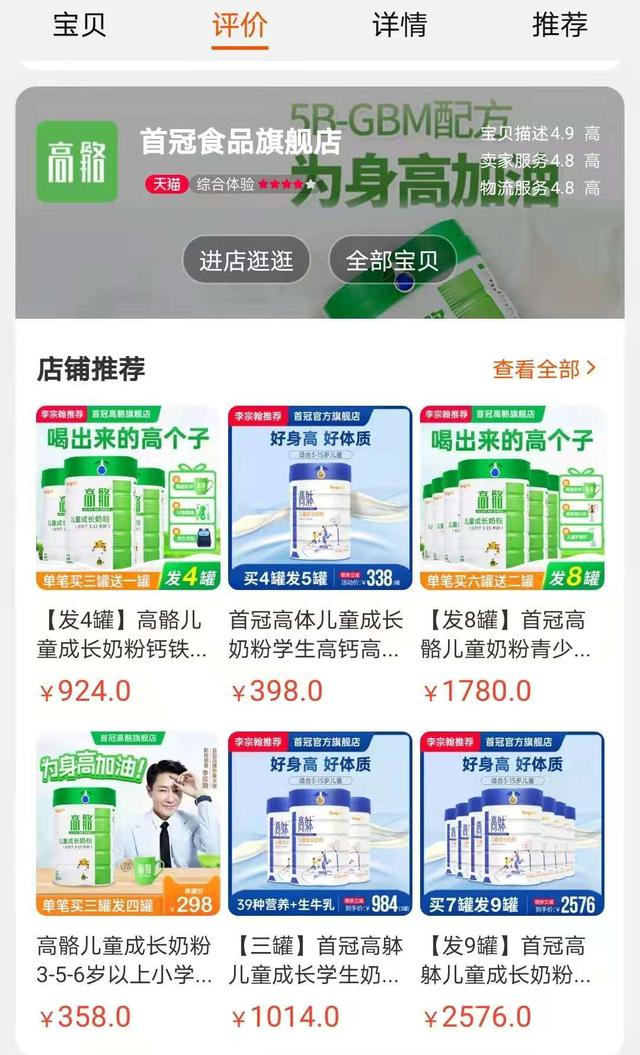 在首冠食品旗舰店,“好身高”“喝出来的高个子”“好身高 好体质”“为身高加油”等宣传语随处可见。其高骼奶粉产品页面宣称,“身高决定视野,成就取决身高。据统计美国43任总统中,只有5位低于平均身高”。同时,该页面还宣称“全面均衡营养,四位一体身高管理系统,更适合中国儿童成长的专属配方。”在评论区,消费者关心最多的问题也是围绕“长高”,如“这个奶粉真的能帮助长高吗”“请问喝了这奶粉的,至今长高了多少”。