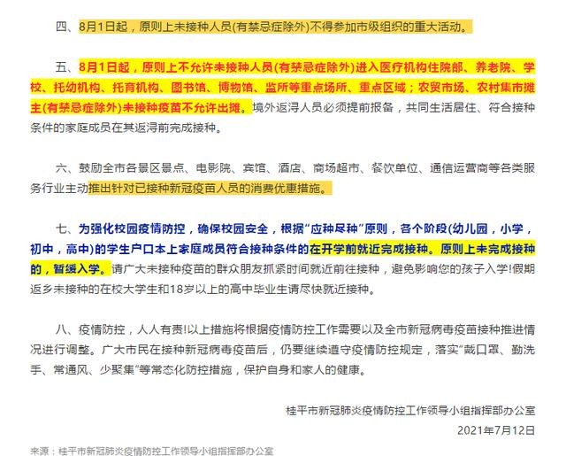 此外,桂平市通告还要求,8月1日起,未接种人员不得参加市级组织的大型活动,以及不允许进入医疗机构住院部、养老院、学校、图书馆、博物馆、农贸市场等地。
