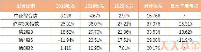 风险和收益是我们投资首要关注的两个指标,股票的收益高但也意味着可能出现更大的回撤。用中证综合债和沪深300分别代表债市和股市的收益率,按照如下三个比例搭配,2018~2020年的累计收益和最大年度亏损。