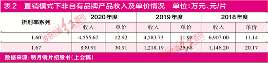 而聚焦到其扩产的两个系列产品来看,从自有品牌产品出发,2018-2020年,直销模式下,其1.60系列常规片销量分别为163.37万片、133.28万片和104.3万片;经销模式下,该系列产品销量分别为174.55万片、163万片和143.72万片。折射率1.67系列产品在直销模式下的销量分别为82.52万片、63.43万片和49.98万片;经销模式下,该产品销量分别为66.49万片、62.79万片和51.54万片。