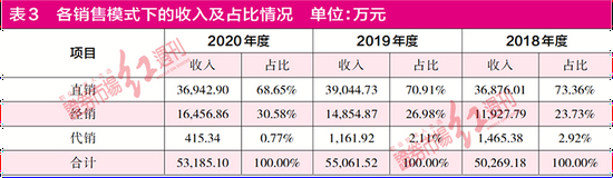 虽然经销模式的收入逐年增长,但企业经销商的数量正在逐年减少。招股书显示,2018-2020年三年内,其经销商数量分别为95个、91个、82个,企业经销商数量逐年减少,且除了2018年新增两个经销商外,2019-2020年,企业并无新增经销商。