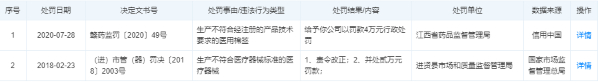此外,南昌市恩惠医用卫生材料有限公司2018年因“生产不符合医疗器械标准的医疗器械 ”被处2万元罚款;2020年7月因“生产不符合经注册的产品技术要求的医用棉签 ”被罚款4万元。