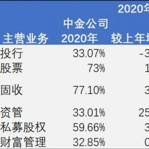 中金公司的财富管理和衍生品业务受到机构的双双看好,亦有机构将中金公司对标小而美的“友邦保险”。国泰君安研究人员对中金公司评价称,公司20年金融资产快速扩张,其中客需型的衍生品业务预计是金融资产扩张的最主要原因。金融资产扩张带来公司投资业务20年实现收入131.3亿元,同比增长87.0%,是公司营收增长的主要驱动力,也是公司整体业绩增速超过行业的最主要原因。