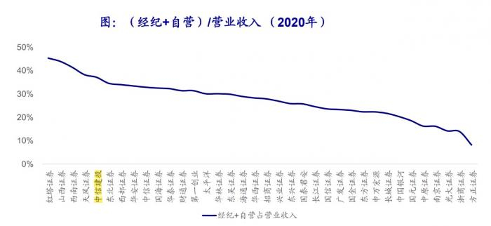 由于券商们的经纪业务同质化非常严重,且中信建投过去一年并未出现大量关闭线下营业部、或者客户数爆发式增长,因此猜测“自营+经纪”业务高营业利润率主要来自自营投资的贡献。根据海通证券数据,2020年,经纪+自营占营业收入的比重,中信建投排在行业第五,而剔除掉排在前面的中小券商,中信建投在中大型券商中排名实际上是第一。(由于中小券商的业务基数小,经营数据上的变化很容易带来百分比的大波动)