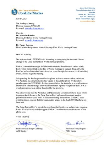 澳大利亚昆士兰大学教授奥韦·霍格-格尔伯格、詹姆斯·库克大学教授特里·休斯在内的5名珊瑚专家也在向联合国教科文组织总干事提交的联名信中表示,大堡礁近年来发生了3次大面积白化现象,全球变暖等因素也加剧大堡礁生态恶化趋势,但澳政府却没有在减少碳排放等全球应对气候变化行动中发挥应有作用。