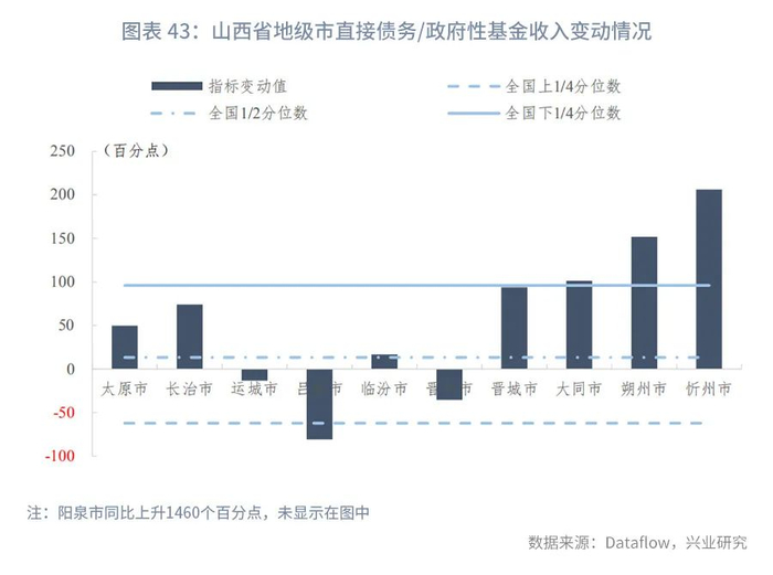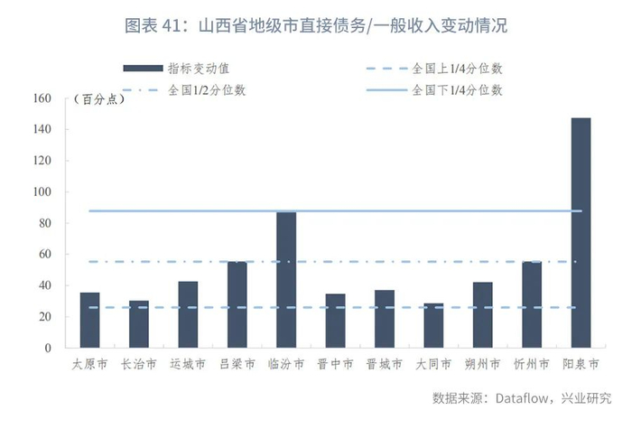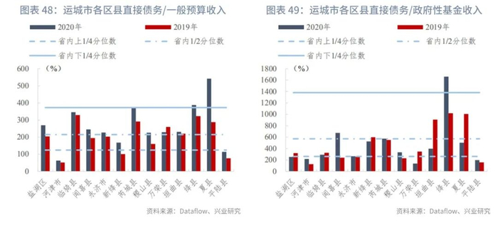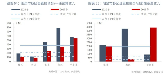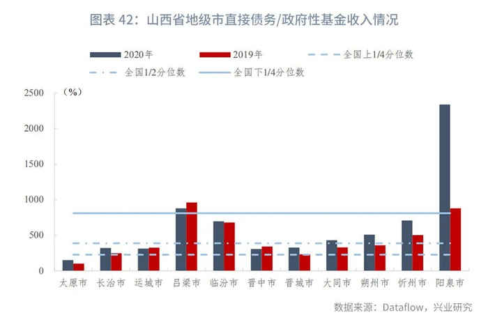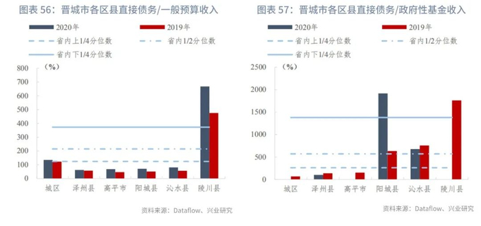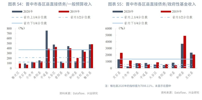 分区县来看,截至2020年末,山西省各区县直接债务/一般预算收入的上1/4、中位数和下1/4分位数分别为124.36%、214.89%、372.72%,指标变动的上1/4、中位数和下1/4分位数分别为14.13个百分点、34.05个百分点、69.47个百分点。直接债务/政府性基金收入的上1/4、中位数和下1/4分位数分别为261.46%、570.89%、1380.63%,指标变动的上1/4、中位数和下1/4分位数分别为-235.39个百分点、9.63个百分点、424.88个百分点。