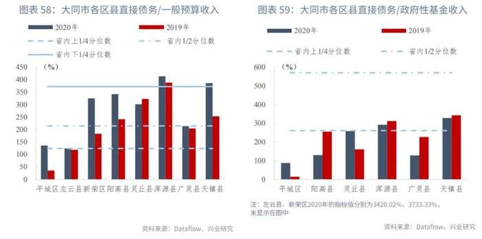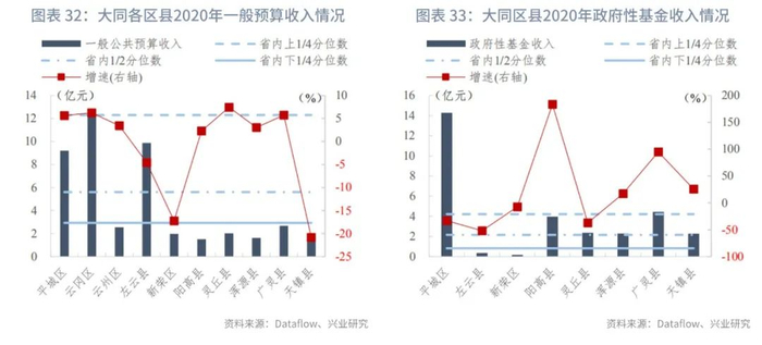 大同市各区县一般预算收入和政府性基金收入规模分化。大同市下辖10个区县,仅云冈区(12亿元)、左云县(10亿元)和平城区(9亿元)的一般预算收入规模超过省内1/2分位数;其余各区县均低于省内下1/4分位数。一般预算收入增速方面,左云县、新荣区、天镇县同比分别下降4.58%、17.21%、20.81%,其他区县实现正增长,增速在2%-7.5%区间。政府性基金收入方面,云冈区、云州区未披露2020年数据,平城区的政府性基金收入远超其他各区县,达到14亿元,远高于省内上1/4分位数;广灵县、阳高县则处于省内上1/4分位数附近;灵丘县、浑源县、天镇县实现2.2-2.4亿元,处于省内中位数附近;左云县(0.4亿元)、新荣区(0.2亿元)则处于省内末25%区间。政府性基金收入增速方面,平城区、左云县、新荣区和灵丘县的收入规模同比下降,其他区县的增速均为正,其中阳高县的增速最大(183.72%)。