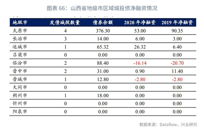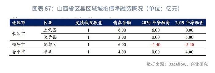分区县来看,山西省城投平台分布于117个区县中的4个区县,分别为长治市上党区、长子县,临汾市尧都区,晋中市祁县。其中上党区2020年净融资为正(6亿元),尧都区为净偿还(-5.40亿元),长子县、祁县的平台2020年净融资均为零。