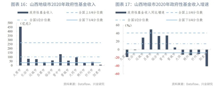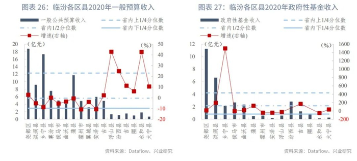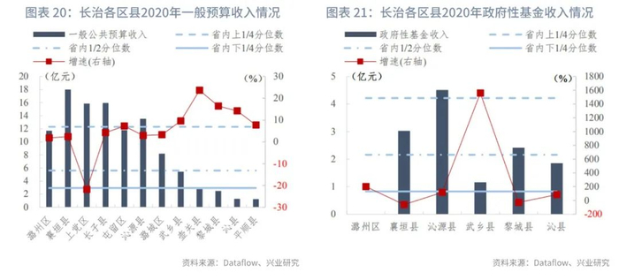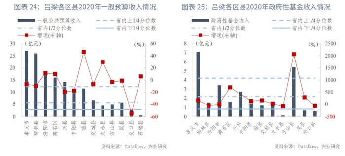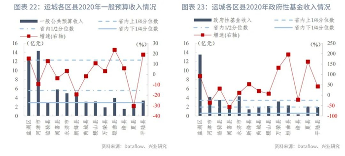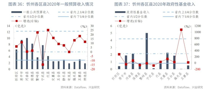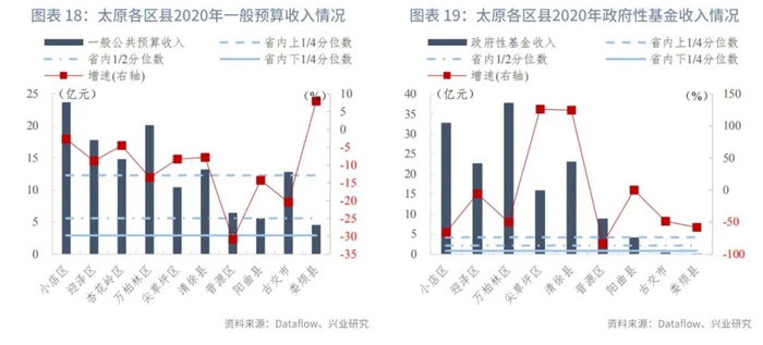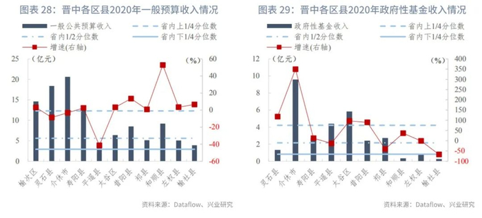 分区县来看:我们统计了山西省117个区县的一般预算收入及政府性基金收入。在已披露数据的区县中,一般预算收入的上1/4、1/2、下1/4分位数分别为12亿元、6亿元和3亿元,一般预算收入同比增速的上1/4、1/2、下1/4分位数分别为7.99%、2.47%和-6.43%。政府性基金收入[1]的上1/4、1/2、下1/4分位数分别为4亿元、2亿元和1亿元,政府性基金收入同比增速的上1/4、1/2、下1/4分位数分别为125.17%、23.59%和-36.29%。