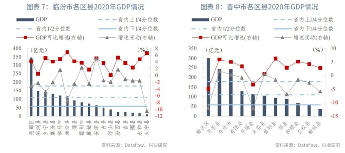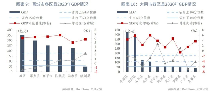分区县来看,山西省117个区县中,110个区县已披露2020年GDP规模数据,省内上1/4、中位数、下1/4分位数分别为179亿元、109亿元、58亿元,GDP可比增速的上1/4、中位数、下1/4分位数分别为-0.2%、-1.8%、-3.7%。