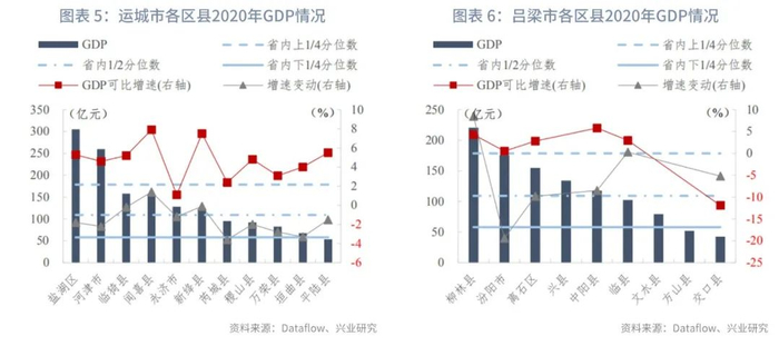 吕梁市下辖13个区县,孝义市、交城县、岚县和石楼县尚未披露2020年GDP数据。已披露数据的9个区县中,柳林县(221亿元)是吕梁市唯一一个超过省内上1/4分位数的区县;方山县(52亿元)、交口县(42亿元)最小,略低于全省下1/4分位数。从GDP可比增速来看,交口县2020年GDP可比增速为-11.9%,出现较大幅度下降,其余已披露增速数据的各区县均为正增长,其中中阳县增长最快,为5.8%,处于全省上1/4分位水平。