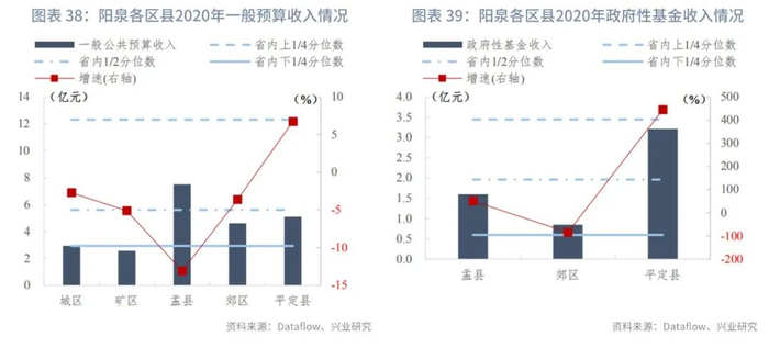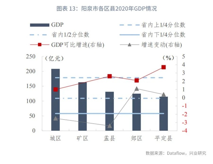 阳泉市下辖区县的经济体量普遍较大,经济增速较低。阳泉市下辖5个区县,GDP规模均高于省内中位数,城区GDP规模最大,为208亿元,高于省内上1/4分位数;平定县(115亿元)最低。从GDP可比增速来看,矿区未披露2020年增速数据,其他各区县均实现正增长,其中平定县可比增速最高,为3.7%,仍低于省内中位数。