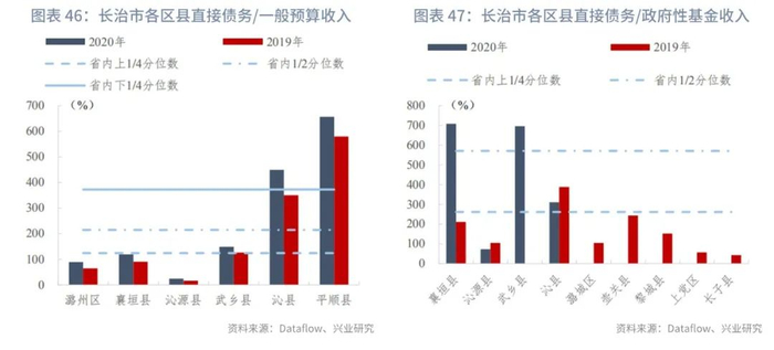 长治市下辖区县的政府直接债务负担尚可。从直接债务/一般预算收入指标来看,仅6个区县已披露2020年数据,潞州区(89.45%)、沁源县(24.31%)、襄垣县(119.06%)优于省内上1/4分位数,沁县(449.82%)、平顺县(656.96%)则超过省内下1/4分位数。从指标变动来看,各区县指标值均有不同程度上升,其中上升幅度最大为沁县,同比上升99.57个百分点。从直接债务/政府性基金收入指标来看,2020年数据已披露的四个区县均低于省内下1/4分位数,其中襄垣县(708.03%)、武乡县(695.94%)的指标值高于省内中位数;最小的沁源县(72.94%)则低于省内上1/4分位数。与2019年相比,襄垣县的直接债务/政府性基金收入指标升幅最大,上升了497.39个百分点;沁源县、武乡县、沁县则出现了下降。