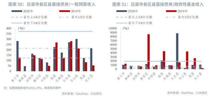 吕梁市下辖区县的政府直接债务负担尚可。从直接债务/一般预算收入指标来看,已披露的12个区县中,柳林县、中阳县的指标值较低,分别为47.72%,82.75%,均优于省内上1/4分位数;石楼县指标值最高(1931.14%),超过省内下1/4分位数,远高于其余区县,债务负担较重。从指标变动来看,除临县、文水县有所下降外(分别同比下降42.64、10.64个百分点),其余区县均有所上升,上升幅度最大的是石楼县,同比上升604.22个百分点。从直接债务/政府性基金收入指标来看,临县、文水县均高于省内下1/4分位数,指标值超过2000%。方山县(275.89%)最低,略高于省内上1/4分位数。指标变动方面,文水县、交口县、柳林县上升幅度较大,主要由于政府性基金收入大幅减少所致。