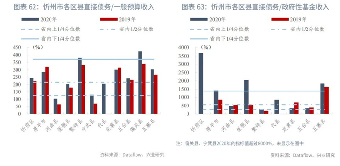 忻州市下辖区县的政府直接债务负担偏重。从直接债务/一般预算收入指标来看,已披露数据的11个区县中,7个区县的指标值超过省内中位数,其中偏关县(425.16%)、繁峙县(382.61%)均高于省内下1/4分位数。河曲县的指标值最低,为103.37%,优于省内上1/4分位数。从指标变动来看,除原平市、定襄县略有下降外(分别同比下降32.42、12.22个百分点),其余区县均有所上升,上升幅度最大的是代县,同比上升了205.76个百分点。从直接债务/政府性基金收入指标来看,偏关县、宁武县、忻府区、保德县、五寨县均高于省内下1/4分位数,指标值超过1800%。最低的是繁峙县(292.07%),略高于省内上1/4分位数。