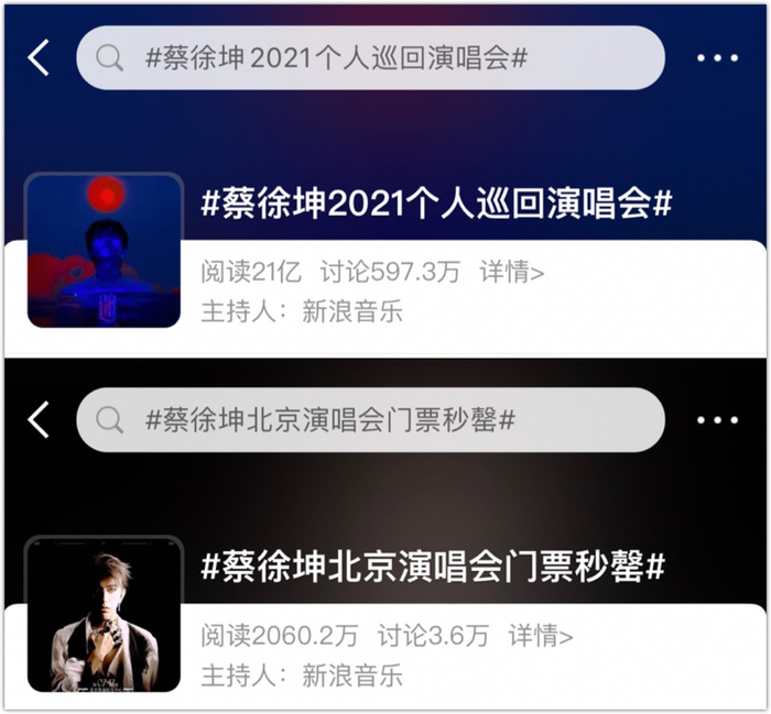 这就很好理解,为什么演唱会的消息频频登上热搜,北京场门票开售即秒罄。截止目前,“蔡徐坤2021个人巡回演唱会”相关话题阅读量高达21亿,仅讨论就有597万。