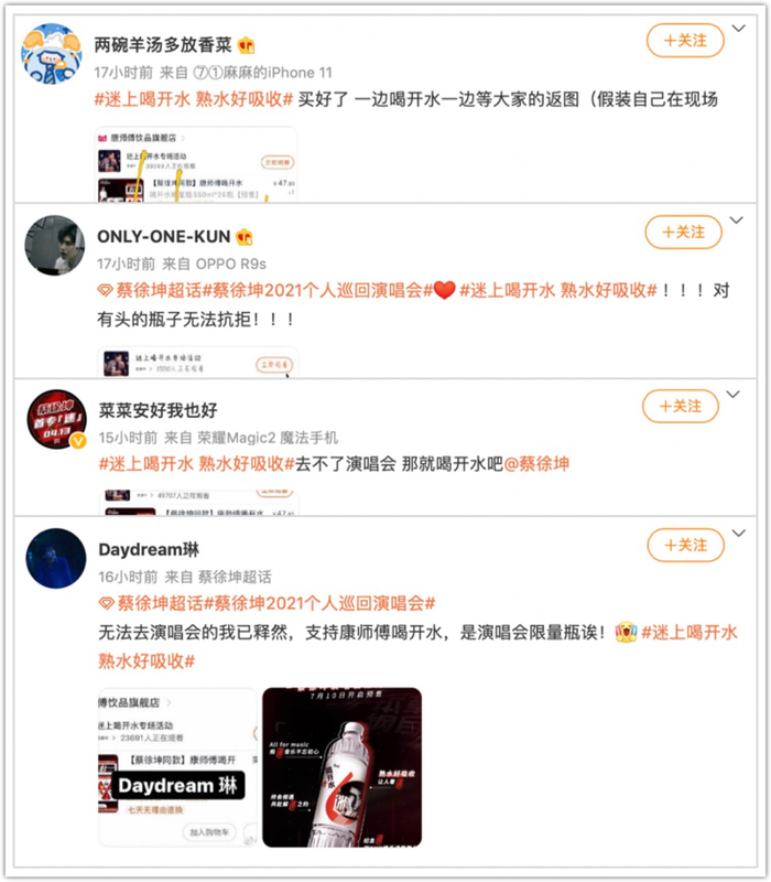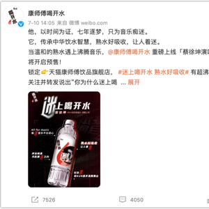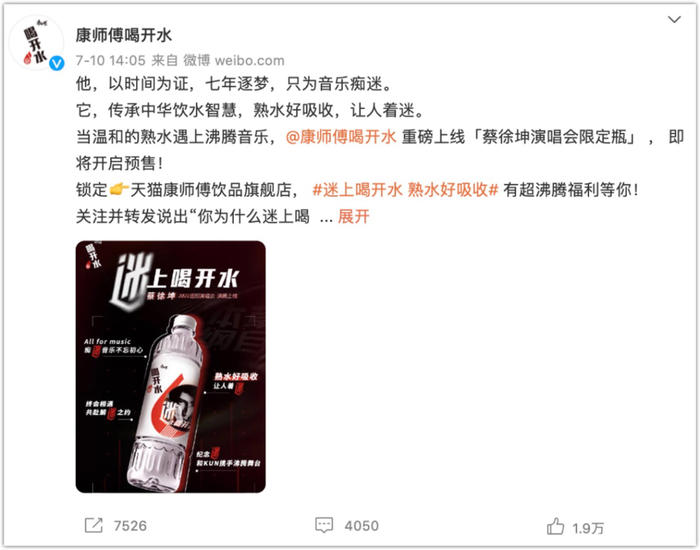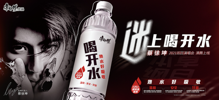 7月10日,蔡徐坤2021巡回演唱会《迷》官宣赞助商,康师傅喝开水位列其中。消息一出,中国饮品市场一片沸腾。
