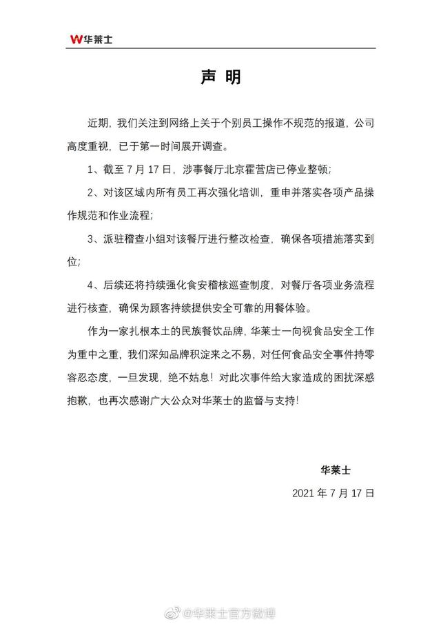新京报讯(记者 王萍)针对华莱士被曝光后厨一系列操作不规范问题,7月17日晚,华莱士通过其官方微博发出声明致歉,表示涉事餐厅为北京霍营店,已停业整顿,并派驻稽查小组对该餐厅进行整改检查。