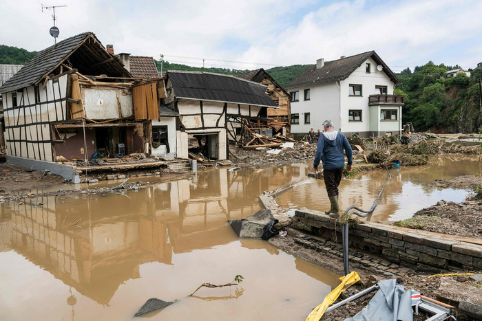 当地时间2021年7月15日,德国舒尔德,暴雨引发洪水灾害,房屋遭破坏。西欧多国近日遭暴雨洪涝侵袭,降水量打破记录,引发河水决堤。截至16日中午,,德国死亡人数已升至103人,比利时死亡人数增至14人。此外,还有约1300人下落不明。