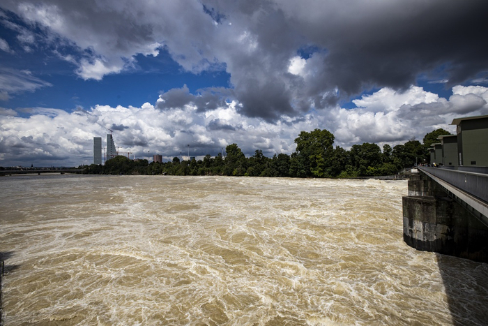 当地时间2021年7月16日,瑞士巴塞尔,当地暴雨洪水灾害持续,莱茵河水位超标,航运被迫暂停。
