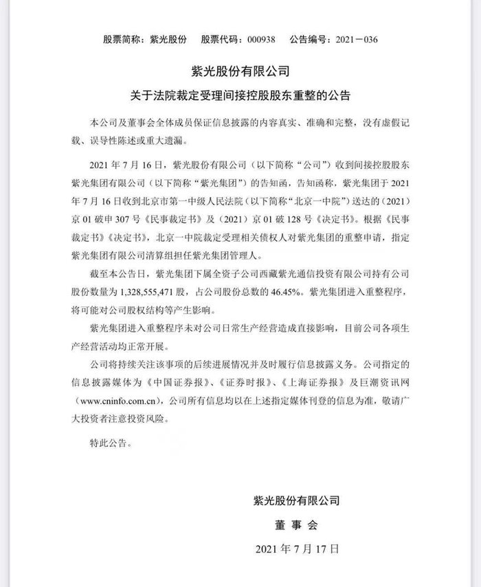 时隔一周,总资产2966亿元的紫光集团破产重整被裁定。7月16日晚间,紫光集团旗下上市公司紫光股份(000938.SZ)、紫光国微(002049.SZ)、学大教育(000526.SZ,)先后发布公告称收到控股股东紫光集团的告知函,法院裁定其破产重整。