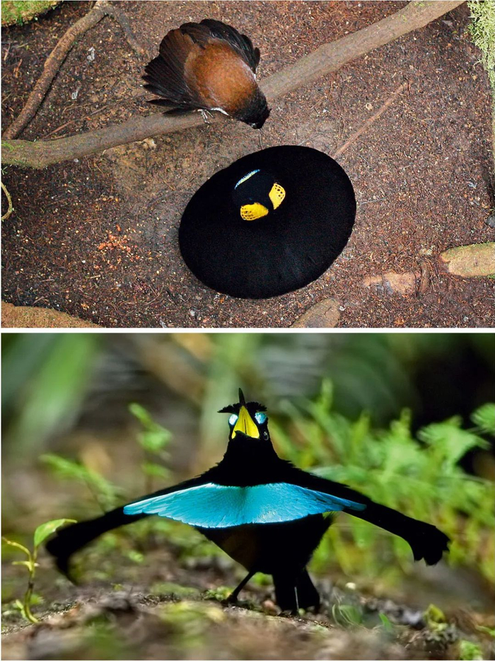 在食物永远丰盛的雨林中,鸟类有充足的时间打扮自己,一只雄性极乐鸟正在向雌鸟进行芭蕾式表演,以吸引注意。