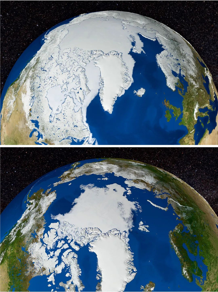 | 北极海冰年度最大覆盖范围和年度最小覆盖范围卫星图;两个范围都在不断创下历史新低