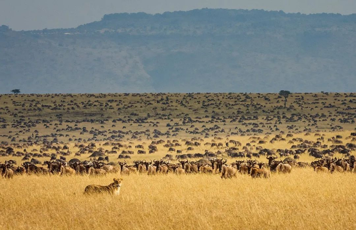 非洲塞伦盖蒂平原角马与狮子