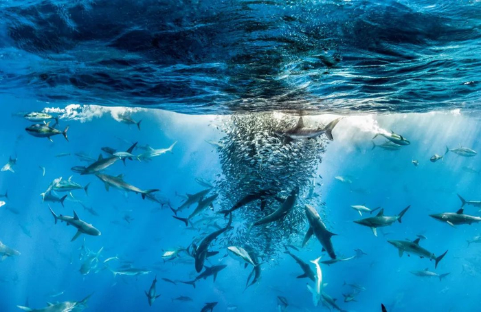 一场狂暴取食正在太平洋上演着,各种肉食性鱼类从各个方向取食聚集成球的白鲑和西鲱。