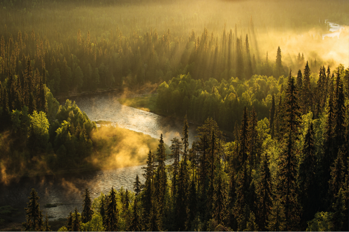 欧洲北部未被砍伐的天然森林,在阳光下呈现出“丁达尔效应”。