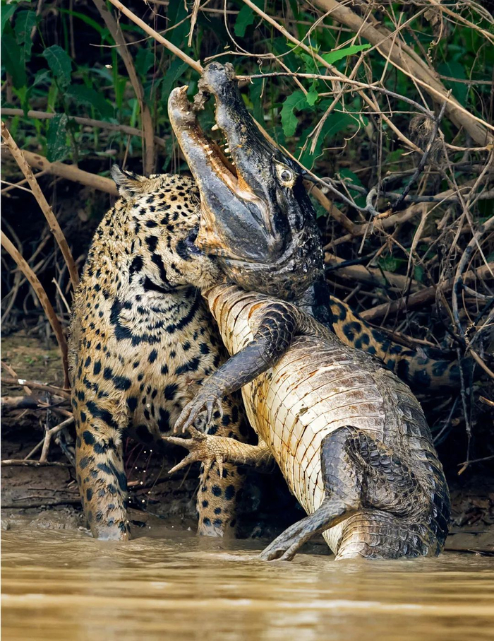 一场生死搏斗正在湿地上演,美洲豹紧紧地咬住了凯门鳄的喉咙,看来胜负已分。