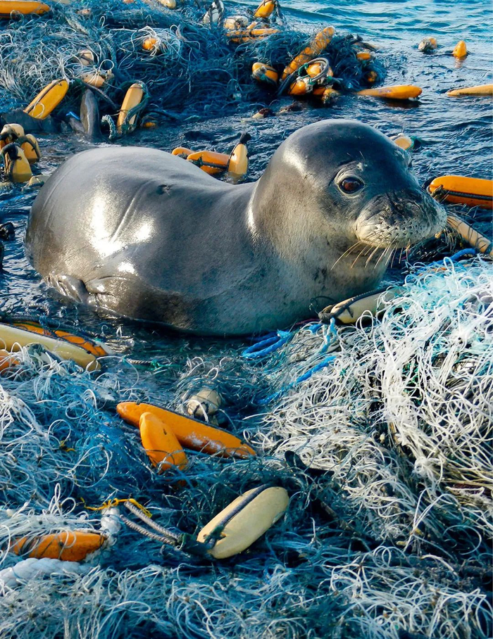 | 被废弃渔具困住的海豹
