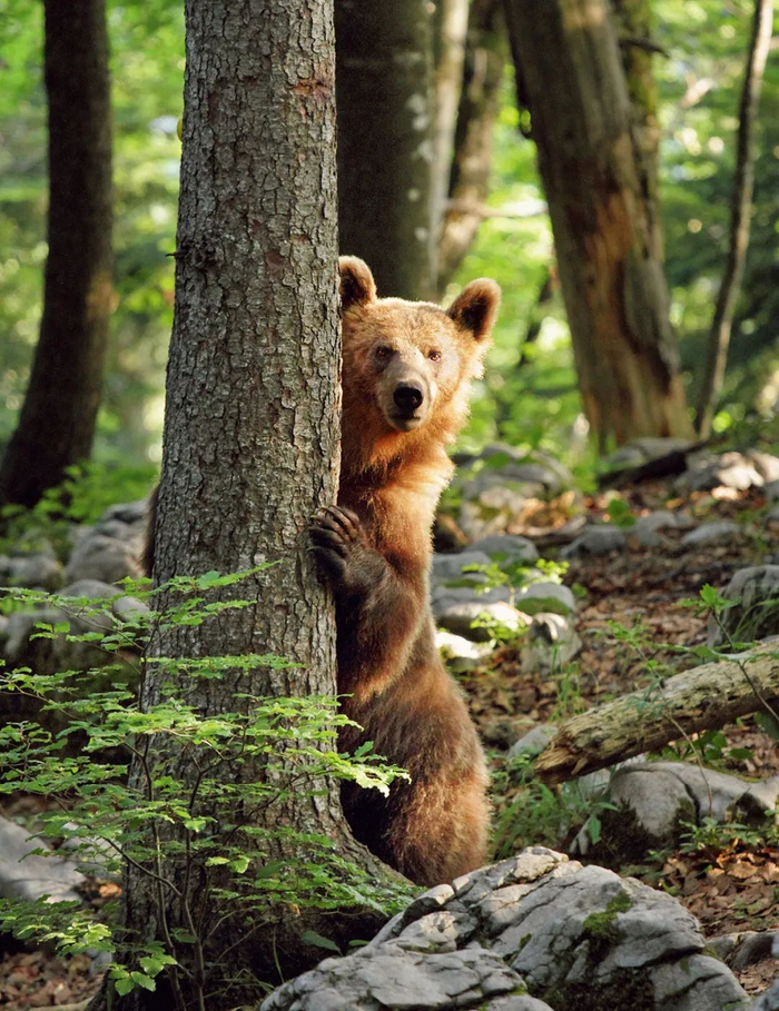 一头棕熊仿佛看到了对面的摄像机,在树后紧张又好奇地打量着。