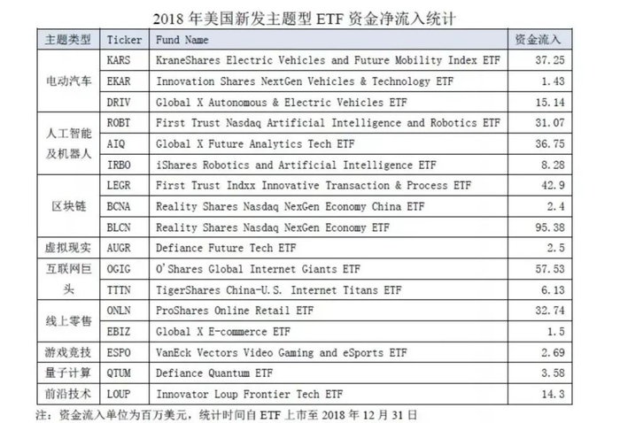 众所周知,美国被动型指数基金方面的发展已经非常成熟,且竞争较为激烈,从2018年的新发产品来看,他们的资产管理机构同样在重点布局新经济和前沿技术领域的主题型ETF产品,包括电动汽车、人工智能及机器人、区块链、虚拟现实、游戏竞技等。
