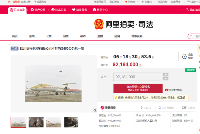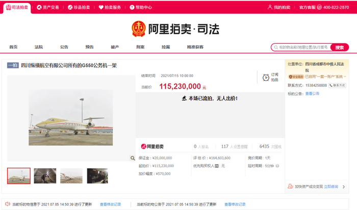 7月14日上午10时,四川纵横航空有限公司的一架湾流G550公务机在阿里司法拍卖平台开拍,该架公务机起拍价与评估价均过亿元,吸引了数千人次围观,100多人设置开拍提醒,不过,并无人报名参与竞拍,截止7月15日上午10时,拍卖结束,该架公务机流拍了。
