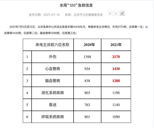 健康时报记者根据北京卫健委官网“120”急救信息进行统计发现,从2021年5月31日至7月12日一个多月时间内,北京急救中心派出的急救车辆用于急救的案例中,位居第一位的为外伤(12907例),第二位为心血管病(8969例),第三位为脑血管疾病(7588例),心脑血管病救治案例共计16557例。去年同期心脑血管病救治案例共计10467例,今年同比增长58%。