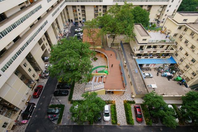 北新桥街道办事处城管办副主任王丁龙介绍,经过多轮的调研和评选,按照最终的改造方案,小区改造在空间上结合人防建筑屋顶,建设了一个二层活动平台,能够让小区居民另有一个新的活动空间,开辟了一个能够有阳光的、老少皆宜的休憩娱乐空间。为了满足小区孩子们的娱乐需求,该处还设置了一个滑梯,可让孩子们直接用滑梯从二层下到一层。