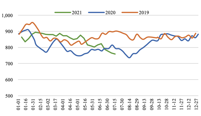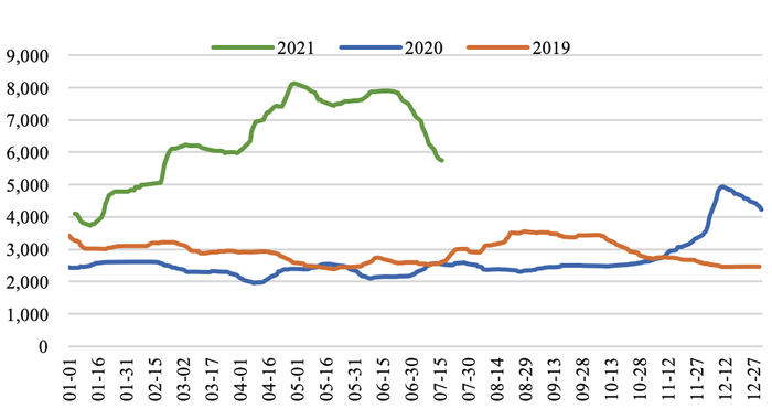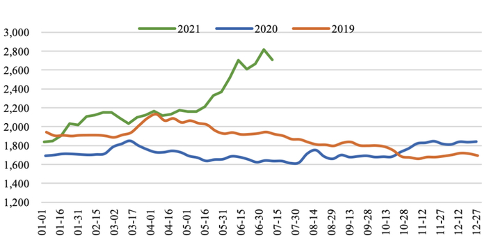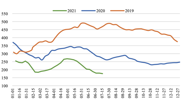 焦炭方面:钢企限产叠加消费淡季,焦炭供需或趋宽松。截至2021年7月16日,汾渭CCI吕梁准一级冶金焦报2500元/吨,周环比下降120元/吨;CCI日照准一级冶金焦报2680元/吨,周环比下降80元/吨。本周焦炭市场弱势运行,受需求端政策持续影响,市场情绪明显转弱,焦炭首轮降价全面落地。