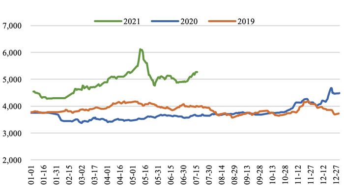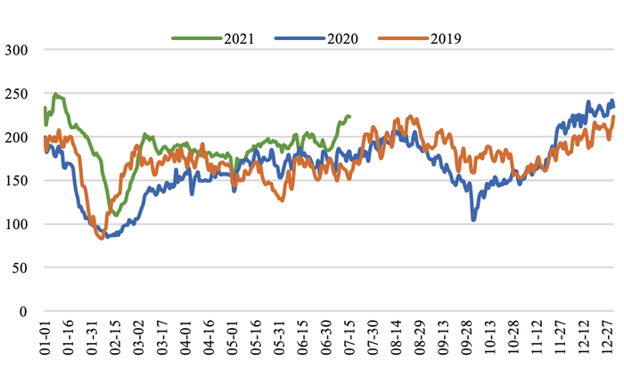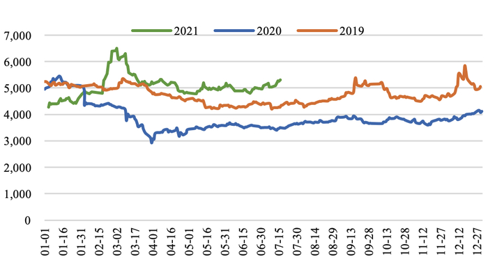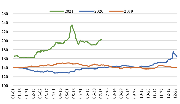 产地生产平稳,煤价小幅上涨。截至7月16日,陕西榆林动力块煤(Q6000)坑口价890.0元/吨,周环比上涨30.0元/吨;大同南郊粘煤坑口价(含税)(Q5500)830.0元/吨,周环比上涨25.0元/吨;内蒙古东胜大块精煤车板价(Q5500)799.0元/吨,周环比持平。本周煤矿依然严格按核定产能生产,整体稳定,中下旬煤管票不足问题或将显现,此外榆林地区郝家梁煤矿发生透水事故或将加剧产地安检形势,短期看增供空间较为有限。旺季需求支撑下坑口价格继续上涨。
