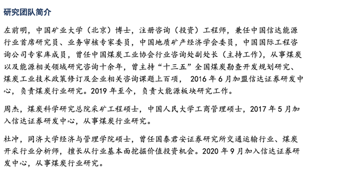 我们认为,当前正处在煤炭经济新一轮周期上行的早中期,基本面、政策面、公司面共振,现阶段配置煤炭板块正当时。供给方面,“十三五”期间“保供应”政策导向下核增/核准产能释放在2019年达峰,2020 年开始明显收敛,而晋陕蒙新以外省区资源枯竭和产能退出加速,全国煤炭产量增量将在2021年继续趋势性收窄,且区域结构性矛盾尤甚;中长期看,行业进入门槛明显抬高,同时大型煤炭集团受制于财务负担和“双碳”目标下的转型述求,新建煤矿的意愿和能力明显收敛,未来供给端增量呈边际收缩态势,并逐步加速(详见信达能源团队2021年6月5日发布的专题报告《煤炭产能趋势深度研究》)。需求方面,根据国家能源局制定的《2021 年能源工作指导意见》指引,2021年煤炭消费占比要从56.8%下降到56%,单位能耗减少3%,我们假设2021年GDP增速6%,煤炭消费增长约0.39(亿吨标准煤),折合原煤约5500万吨;“十四五”期间在GDP保持年均5%的增速下,充分考虑新能源替代,煤炭消费仍将有年均4000万吨以上的增量。综上,表外产能合法化接近尾声,近年新核增/核准煤矿快速收敛且核增门槛提高,限制煤企短期增产潜力;考虑煤企建矿意愿和能力下降以及3年以上的建矿周期,煤炭供给在“十四五”期间或难响应需求增长,煤价有望维持高景气度,在龙头煤炭企业普遍降本增效及内生外延成长下,盈利有望趋势抬升。此外龙头煤企现金盈利能力强劲,同时资本开支收窄,富余现金流更大概率回报股东,改善投资者收益水平。当前煤炭板块估值尚未充分体现行业景气程度及持续性,存在较大修复空间。