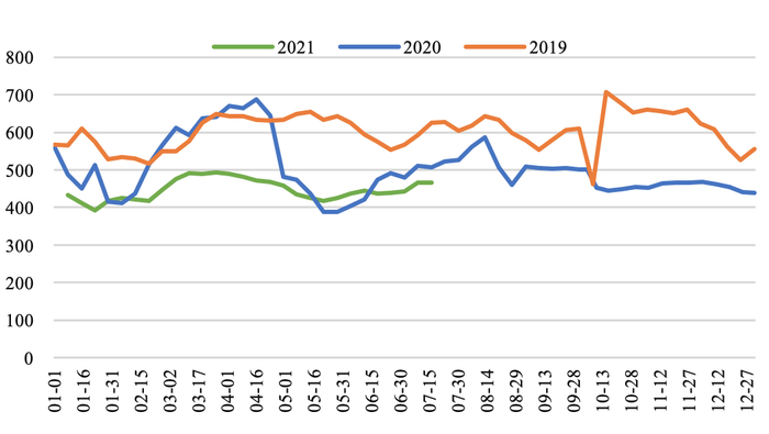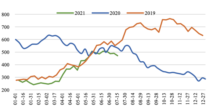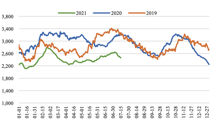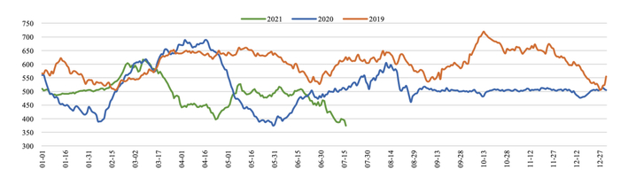 ★ 甲醇价格指数:截至7月16日,全国甲醇价格指数较上周同期上涨57点至2488点。