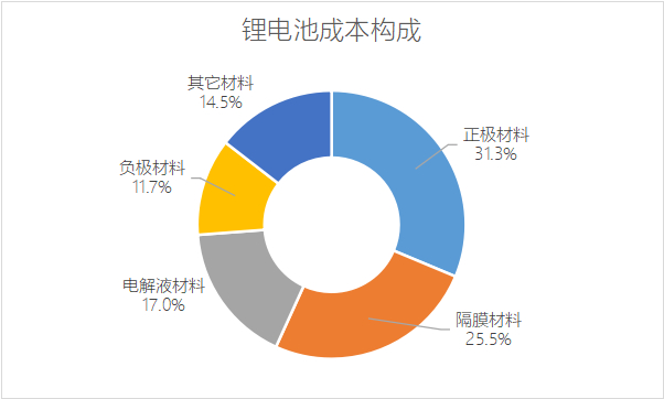 从锂电池的成本构成看,正极、负极、电解液和隔膜为四大关键原材料,在成本中的占比远高于束线、连接器以及导电剂等其它材料——这与锂电池基本工作原理一致[4]。