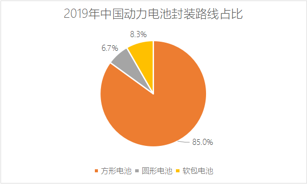 从市占率看,目前方形电池凭借更高的性价比,大幅领先其他技术路线。2019年,国内方形电池装机量为52.73GWh,同比增长 24.8%,占总装机量 84.5%,是年度唯一保持同比正增长的技术路线。